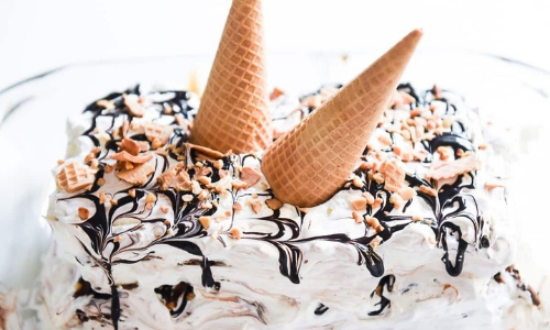 Chi dice che il gelato può essere mangiato solo da solo, può essere mescolato con la torta per renderlo un dessert saporito. La torta sandwich è fatta con le fette di torta rettangolari. Prima di tutto tagliare le forme rettangolari di pan di spagna, quindi coprire lo strato con la crema di ghiaccio e poi coprirlo con un'altra fetta e poi nascondere lo strato con la crema di ghiaccio. Usa sprinkles multicolor e gemme per adornare quel panino con crema di ghiaccio. Ora distribuisci casualmente lo sciroppo di cioccolatini su di esso. Il geniale panino gelato è pronto a sorprendere tua madre.