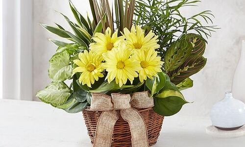 Bene, a volte è degno di ricordare da dove provengono queste bellissime creazioni della natura. Quindi la migliore alternativa ai bouquet floreali è questo giardino piatto con tagli freschi bouquet. Questo bouquet comprende bella vegetazione fresca insieme ai fiori. Tale bouquet porta l'essenza di un intero giardino sul tavolo del posto di lavoro. margherite gialle con bellissimi tagli verdi in un cesto di vimini lo faranno stare tra tutti gli altri bouquet floreali.